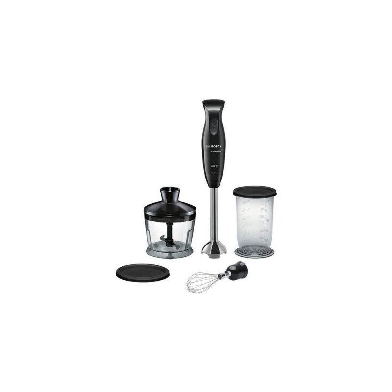 <b>The Bosch CleverMixx: The all-round talent for more fun in the kitchen - with additional SlimFoot</b><br>- Effortless pureeing and mixing, without annoying splashes thanks to the newly designed stainless steel mixer foot.<br>- Ingredients are perfectly mixed and properly pureed in very short time - with the extra-powerful 600 W motor.<br>- With its ergonomic handle, the CleverMixx fits perfectly in your hand, and its low weight also makes it simple and comfortable to use.<br>- Measuring jug included - Measure the required quantity of ingredients easily and mix them in the beaker.The rust free stainless steel mixer foot and other accessories are dishwasher-safe<br><br><b>600 watts — power and convenience.</b><br>Powerful with low noise and low vibrations. The 600-watt motor makes short work of anything you want to mix and crush — and it's incredibly convenient.Bosch MSM2650B. Type: Tabletop blender, Product colour: Black, Certification: CE, Eurasian, ROSTEST, SIQ, UA. Blending bowl material: Plastic, Housing material: Plastic, Handle material: Plastic. Power: 600 W, AC input voltage: 220 - 240 V, AC input frequency: 50 - 60 Hz. Width: 385 mm, Depth: 60 mm, Height: 60 mm. Package width: 130 mm, Package depth: 203 mm, Package height: 405 mm