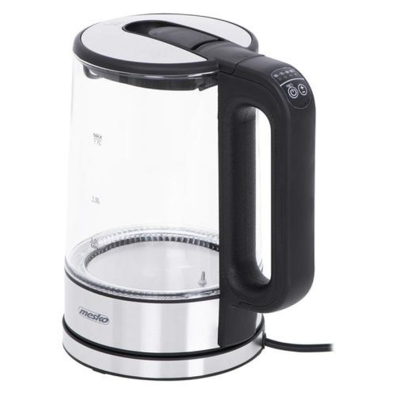 <b>Kettle 1,7 L</b><br><br>A glass kettle with temperature control is a device that should be present in every home. Using kettle, you can choose one of several temperature ranges from 60 to 100 degrees Celsius, thanks to which we can adjust the heat of the water to the type of tea or herbs brewed. The kettle is equipped with a temperature maintenance function. The elegants finish with stainless steel, a charming spout, a convenient opening handle and a rotating base make the device easier for left-handed people and children to use. Interesting accents are also different shades of water backlight depending on the set temperature and the sound signal during start-up and after boiling.Mesko Home MS 1301B. Water tank capacity: 1.7 L. Power: 2200 W. Product colour: Black, Stainless steel, Transparent, Housing material: Glass, Stainless steel, Adjustable thermostat, Water level indicator, Overheat protection, Keep warm function