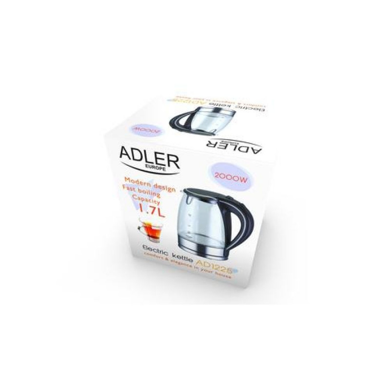 A big electric family kettle allowing to boil water for 6-7 people at one go thanks to its power of 2000 W. The kettle is equipped with a bright water level indicator and automatic switch off, so it will switch off after water boils. Boil-dry protection prevents from switching on an empty kettle, what saves energy and increases the user´s safety. Moreover, a sediment filter will provide appropriate quality of water. For the user´s convenience the kettle was equipped with a 360 degree rotary base and a flat bottom. White-coloured and non-aggressive design. It allows to boil up to 1.7l of water. Equipped with a heating element made of high-grade stainless steel and a pilot light informing that water has just boiled.<br><br>- Capacity 1.7L, min. 0.5L.<br>- Power 2000W.<br>- Concealed heating element.<br>- Big, bright water level indicator.<br>- Automatic switch off.<br>- Boil-dry protection.<br>- Compact baseplate with cord storage.<br>- Rotary base 360 degree.<br>- Modern, ergonomic design.<br>- Anti-calc filter.Adler AD 1225. Water tank capacity: 1.7 L. Power: 2000 W. Product colour: Black, Stainless steel, Transparent, Housing material: Plastic, Water level indicator. Cordless. Filtering