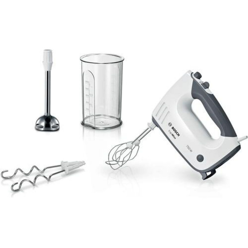 <br />Bosch MFQ37470. Type: Hand mixer, Product colour: Black, White, Mixer functions: Beat, Knead, Mixing, Stirring, Whisking. Blade material: Stainless steel. Power: 750 W, AC input voltage: 220-240 V, AC input frequency: 50/60 Hz. Width: 208 mm, Depth: 74 mm, Height: 154 mm. Package width: 200 mm, Package depth: 230 mm, Package height: 180 mm