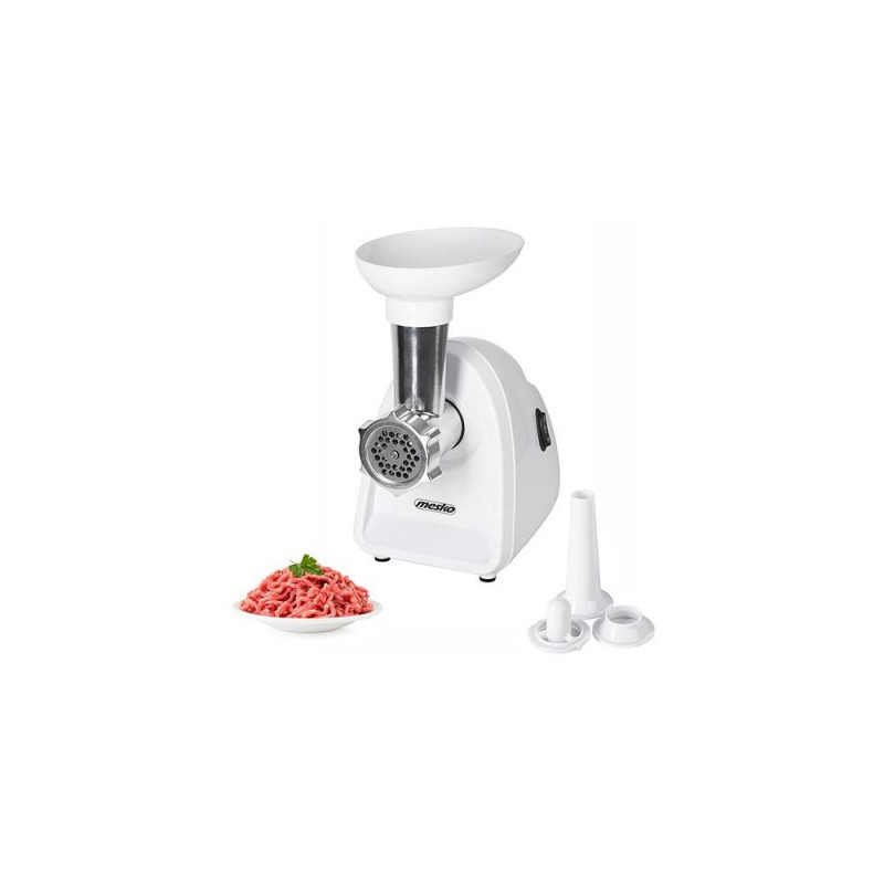 A solid device for those who wish to prepare home made sausages and ground meat. It is equipped with three cutting sieves (exchangeable): one to mince meat, the second for poppy seeds, the third one has the middle-sized holes. In the set a plunger and sausage filler are also included. The whole device is made of durable materials that are easy to be disassembled and cleaned. Apart from the forward mode it has a reverse function. Normally the device is rated at maximum 350W with the leverage power of 1500W.Mesko Home MS 4809. Power: 1500 W, Product colour: White. Accessories included: middle size sieve mince sieve poppy sieve plunger sausage filler, Packaging content: middle size sieve mince sieve poppy sieve plunger sausage filler