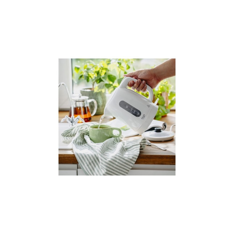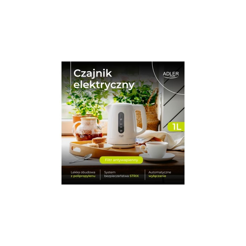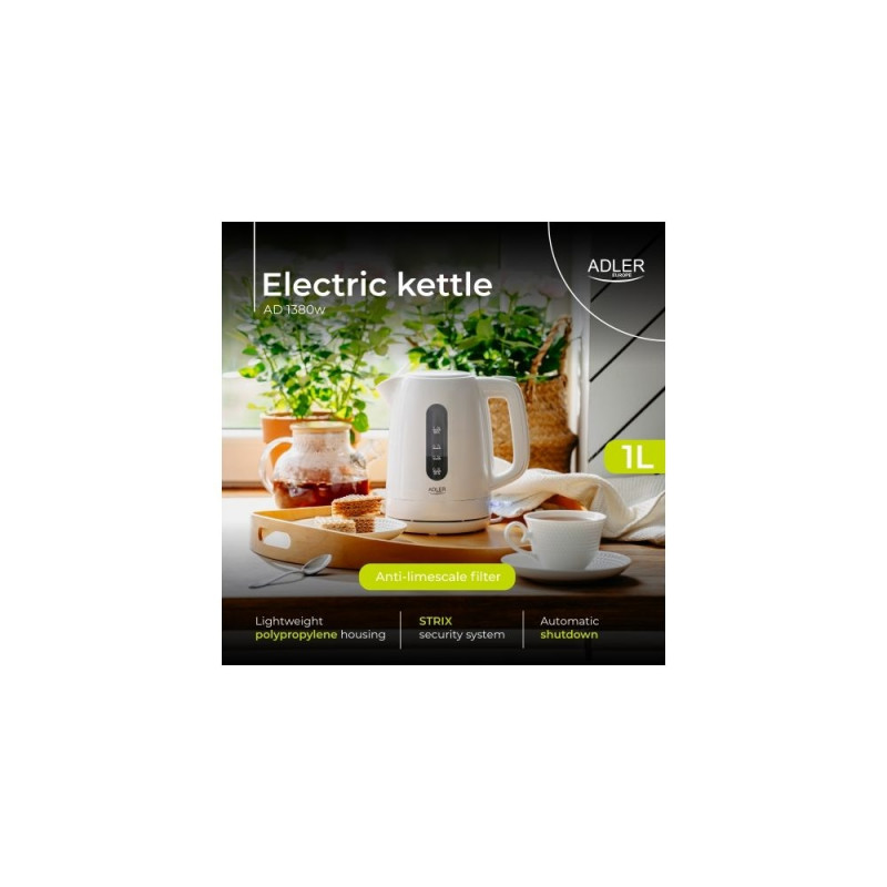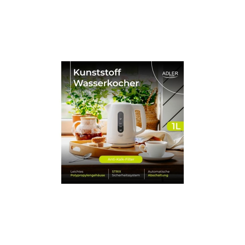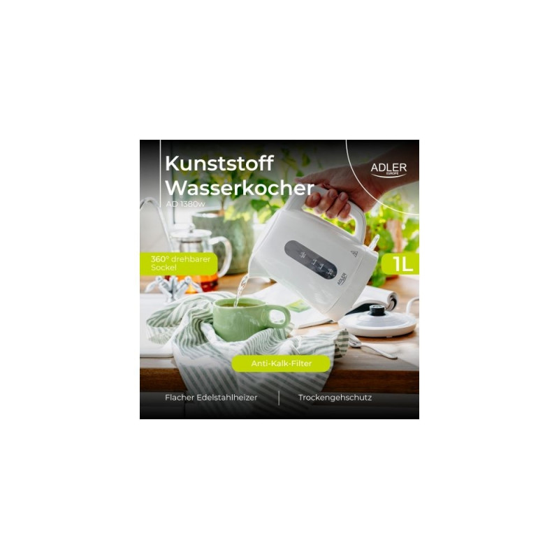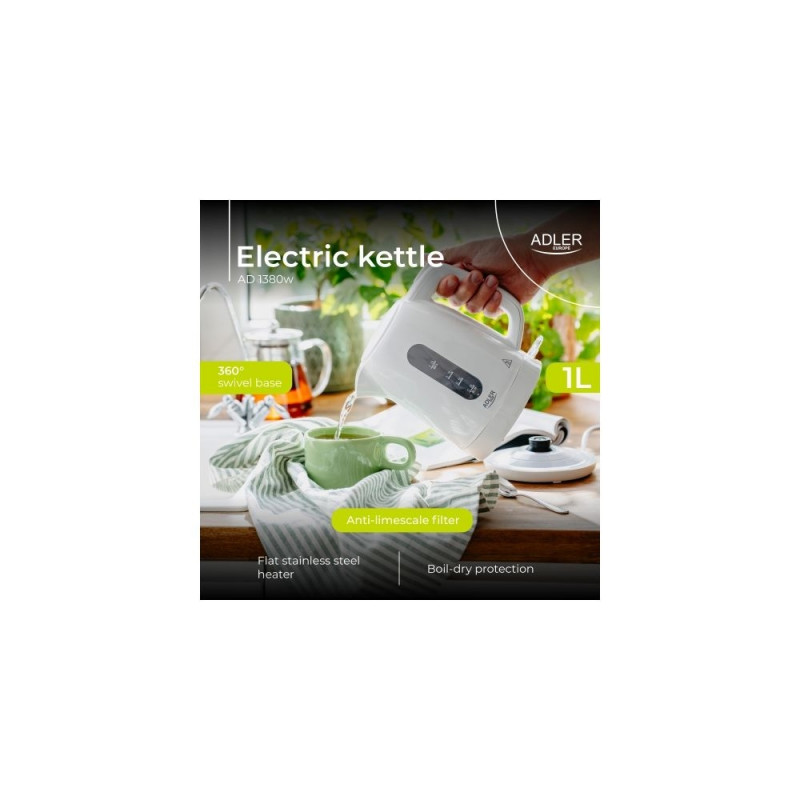 Adler AD 1380w on kompaktne ja funktsionaalne 1-liitrine elektriline veekeetja, mis sobib ideaalselt igapäevaseks kasutamiseks kodus, kontoris, suvilas või ühiselamus. Kerge konstruktsioon ja kaasaegsed turvasüsteemid muudavad vee keetmise mugavaks ja ohutuks.