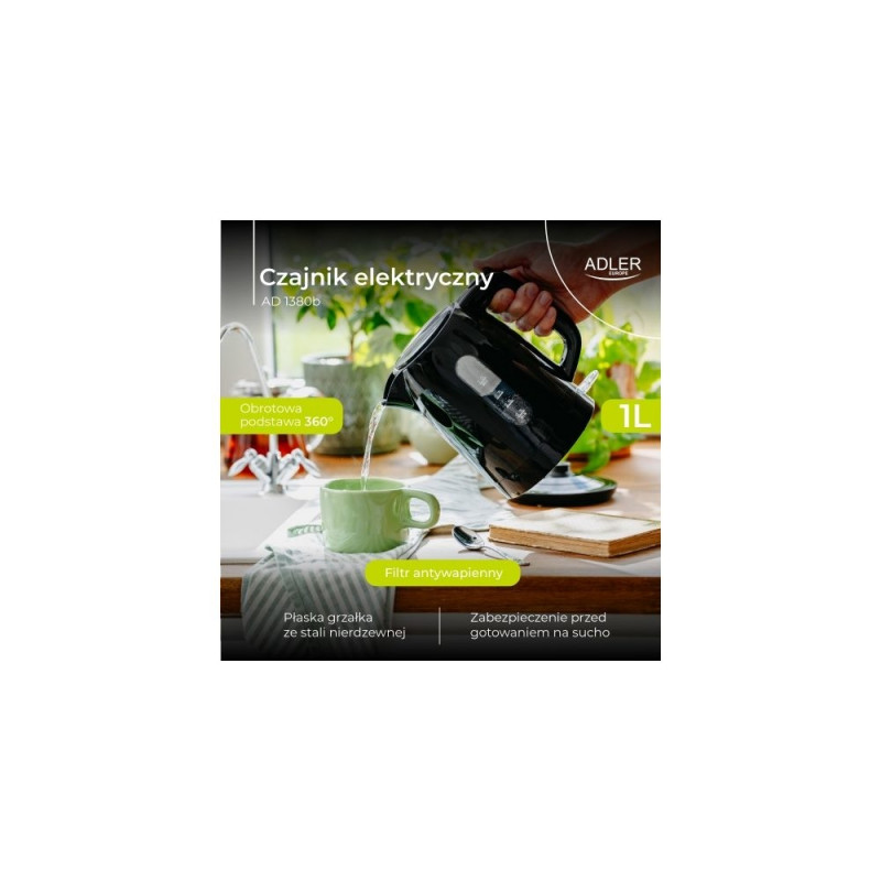 Adler AD 1380w on kompaktne ja funktsionaalne 1-liitrine elektriline veekeetja, mis sobib ideaalselt igapäevaseks kasutamiseks kodus, kontoris, suvilas või ühiselamus. Kerge konstruktsioon ja kaasaegsed turvameetmed muudavad vee keetmise mugavaks ja ohutuks.