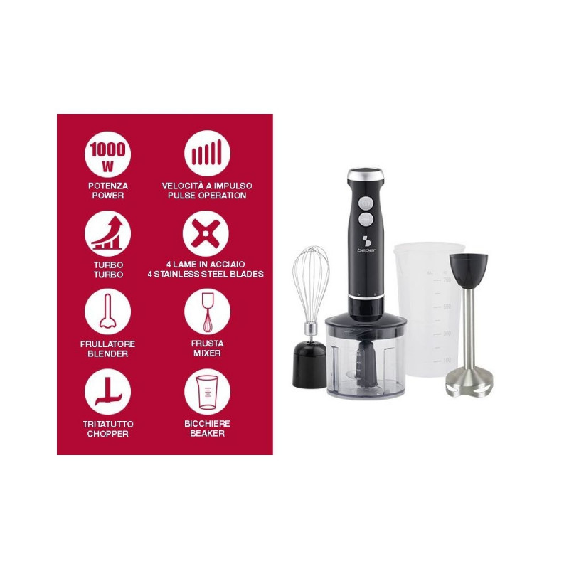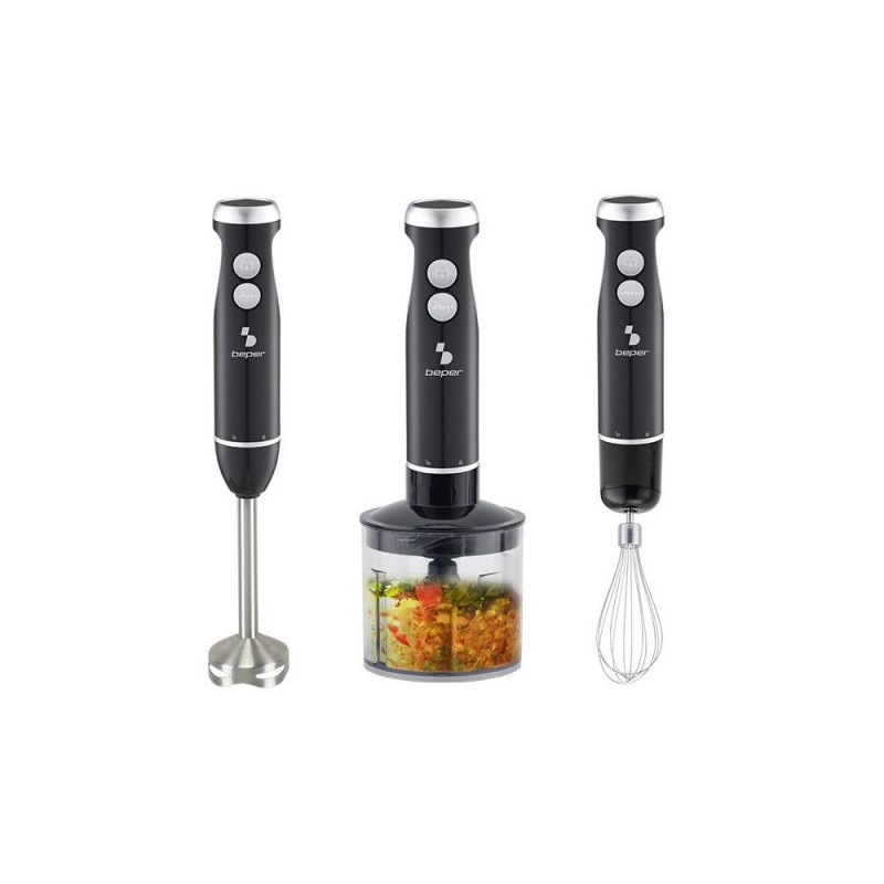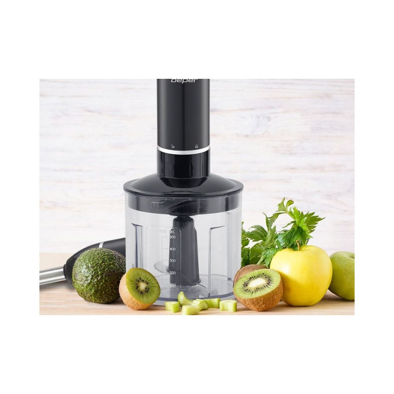 4-ühes saumikseri komplekt erinevate tarvikutega: saumikser, 500 ml terasest teradega hakkija, 700 ml mõõtekork ja terasest vispel. ABS-korpus, ergonoomiline käepide mugavaks haardumiseks. Eemaldatav terasest võll 4 roostevabast terasest teraga. Impulssrežiim optimaalse konsistentsi saavutamiseks ja turbofunktsiooni nupp maksimaalse võimsuse saavutamiseks.