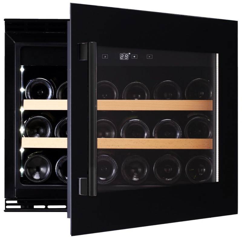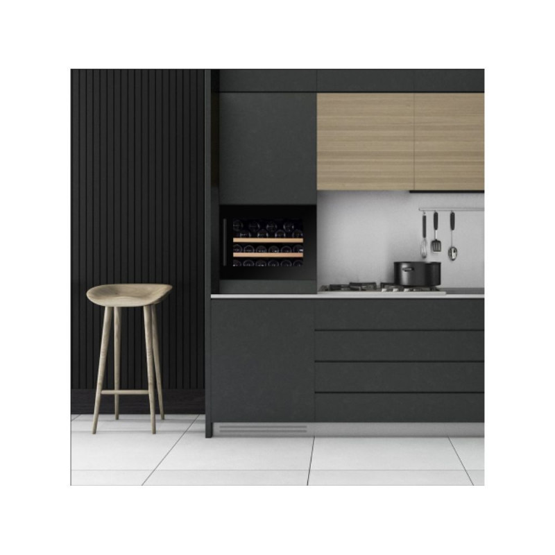 Matt musta klaasuksega ja musta käepidemega integreeritav veinikülmik sobib ideaalselt modernsesse kööki.