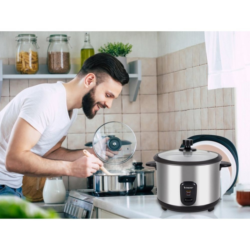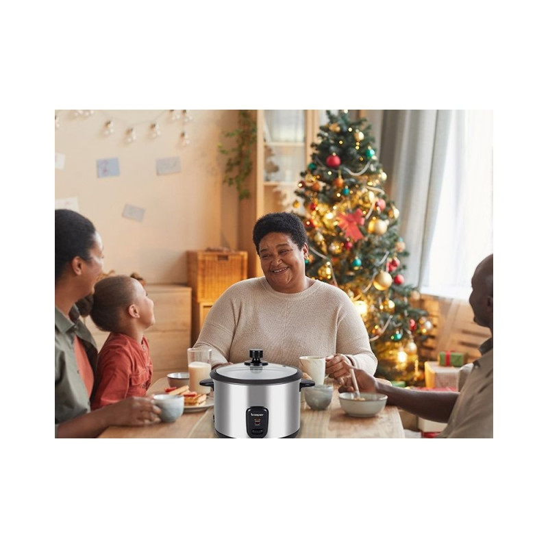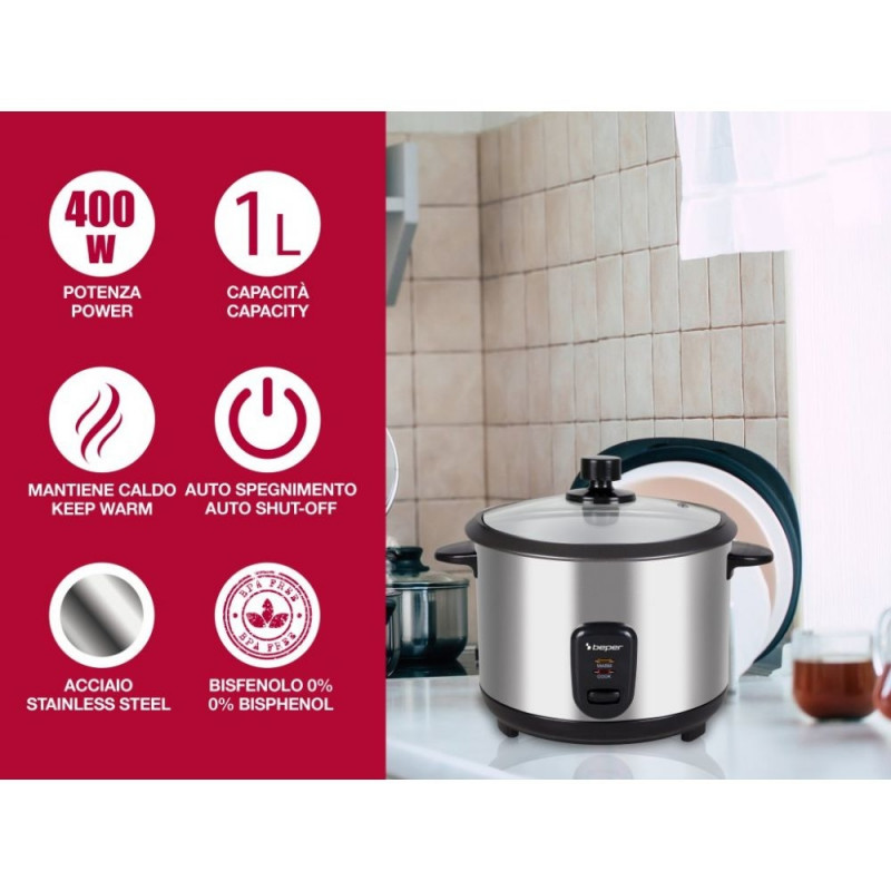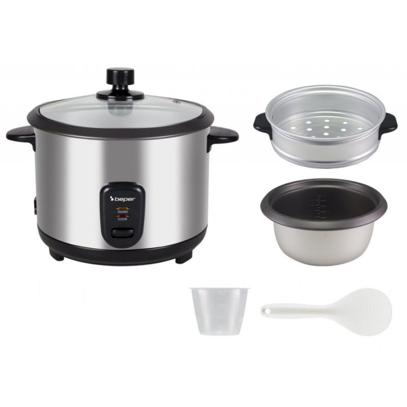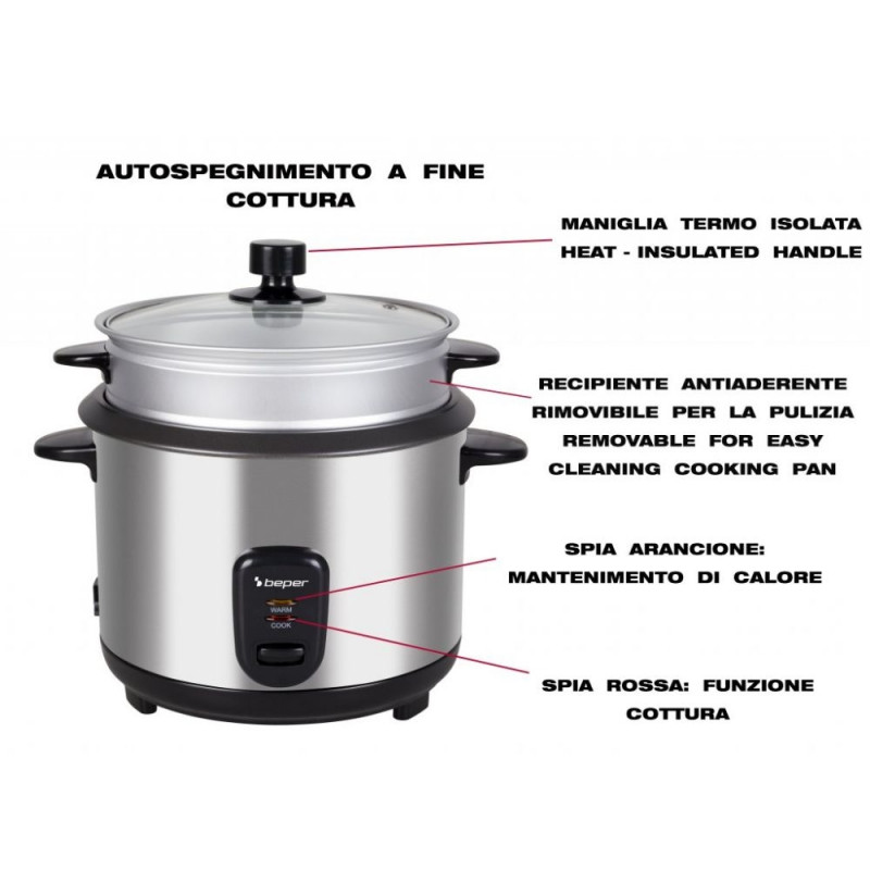 Terasest konstruktsioon jahedate seintega, et vältida põletusi Eemaldatav mittenakkuva alumiiniumist küpsetuspann hõlpsaks puhastamiseks Alumiiniumist alus kala ja köögiviljade aurutamiseks Automaatne väljalülitus küpsetamise lõpus ja soojashoidmise funktsioon Klaasist kaas auruava ja soojusisolatsiooniga käepidemega Eemaldatav toitejuhe otse lauale serveerimiseks Komplektis plastmassist mõõtekork ja lusikas