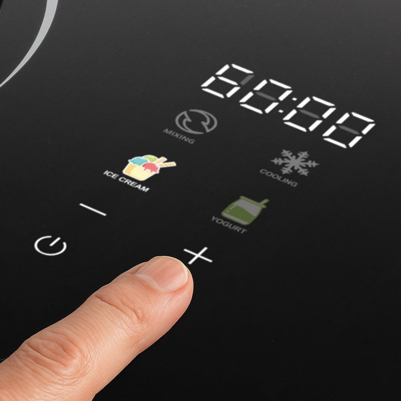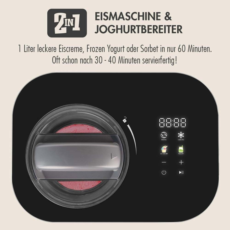 2-ühes jäätisemasin kompressori ja jogurtimasinaga, koheselt kasutusvalmis ilma eeljahutuseta tänu isejahutavale 100-vatisele kompressorile Valmista oma lemmik tervislikku jäätist, külmutatud jogurtit või jogurtit igal ajal: olgu see siis laktoosivaba, vegan, vähendatud suhkrusisaldusega või mahepõllumajanduslike koostisosadega. Ideaalne terviseteadlikele maitseküllastele või toidutalumatusega inimestele Kuni 1 liiter jäätist kõigest 60 minutiga – maitsev jäätis, külmutatud jogurt või sorbett on sageli serveerimisvalmis kõigest 30–40 minutiga Pöörlemisanduritega alalisvoolumootor tagab ühtlase segamiskiiruse – isegi kõvema jäätise puhul Automaatne jahutus hoiab jäätise ideaalse konsistentsina kuni 1 tund Kiire jahutamine temperatuurini -10 °C 5 minutiga ja temperatuurini -30 °C vaid 10 minutiga Lihtne kasutada digitaalse LED-ekraani, otsevalitud programmide abil jäätise / külmutatud jogurti / sorbeti, jogurti, segamise, jahutamise, aja ja praktilise järelejäänud aja indikaatoriga Kompaktne, vaikne ja võimas, mõõtmetega vaid 35,5 x 26 x 22,8 cm – ideaalne väikestesse köökidesse ja paindlikuks kasutamiseks Vastupidav disain vastupidava ABS-korpuse, karastatud klaasist pealispinna ja kvaliteetse, nõudepesumasinas pestava roostevabast terasest anumaga Keskkonnasõbralik külmaaine R600a Lisatarvikud: roostevabast terasest jäätiseanum, spaatel, mõõtekork ja retseptiideed