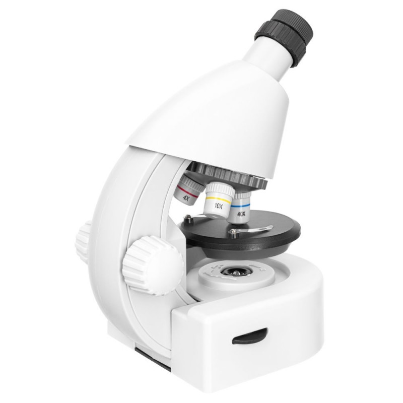 The magnification range is from 40x to 640x, so bacteria or blood cells cannot be seen. However, this microscope will allow you to see something of animal and plant tissues, observe cells as well as examine parts of insects and tiny organisms that live in water. The microscope is equipped with three objective lenses (4x, 10x, and 40x) and a 10x–16x sliding two-position eyepiece. The head inclined at 45° makes extended observation convenient, and the sharpness is adjusted manually using the coarse focusing knobs. The microscope is easy to use, even for an inexperienced user.