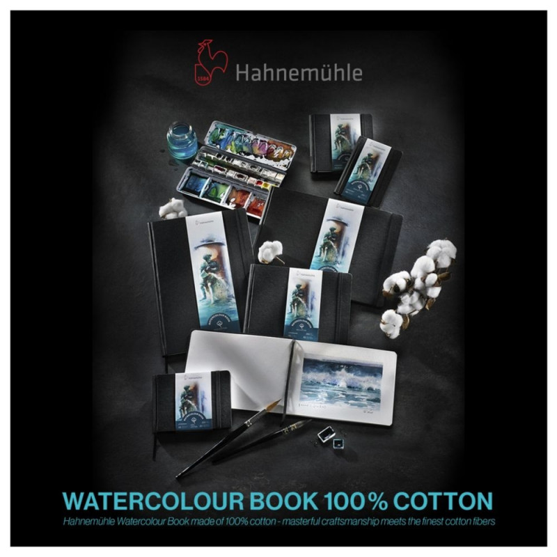 Hahnemühle veevärviraamat, mis on valmistatud 100% puuvillast kiududest, on hädavajalik veevärvikunstnikele. Puuvill annab paberile loomuliku valge tooni, enneolematu tekstuuri ja suure vastupidavuse. Värvid voolavad loomulikult valgele paberile ja innustavad pintslit ja kunstnikke. 250 g/m² paksused 30 lehte paberit on esiküljel ja tagaküljel ühtlase, peeneteralise pinnastruktuuriga, pakkudes kunstnikele 60 lehekülge loovaks kujundamiseks. Raamat sobib kõigile veevärvitehnikatele, eriti märjal märjal tehnikale. Maskipulgad ja maskilindid saab eemaldada jälgi jätmata. Isegi söövitused on tänu pinnakattele lihtsalt võimalikud. Kesköömust, tugev kaas musta järjehoidjaga annab raamatule elegantsi ja stabiilsuse, mida ta hädavajaliku kaaslase jaoks vajab. Elastne riba sulgeb raamatu tihedalt.