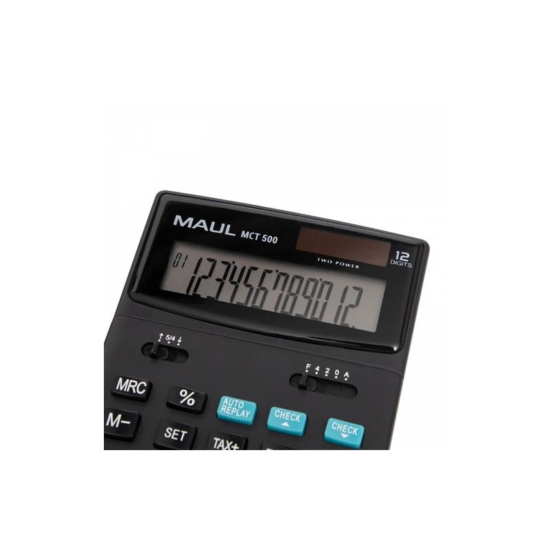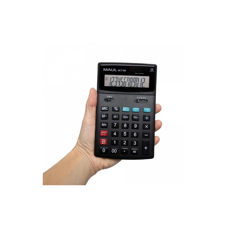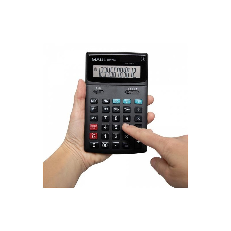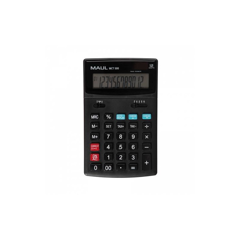 <br />MAUL MCT 500. Form factor: Pocket, Type: Display. Digits: 12 digits, Display number of lines: 1 lines. Memory registers: 3. Tax calculation. Power source: Battery. Product colour: Black