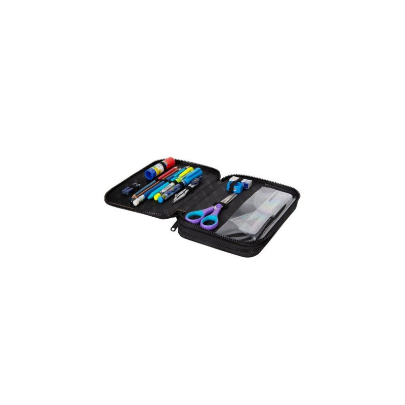 Double decker pencil case with equipment The set includes school accessories: eraser; sharpener; compasses; scissors; set of rulers; glue pen; 2 ink capsules; 6 different writing instruments; 12 colored pencils; 10 colored felt markers; Size: 20 x 14 x 5 cm. Material: poliester