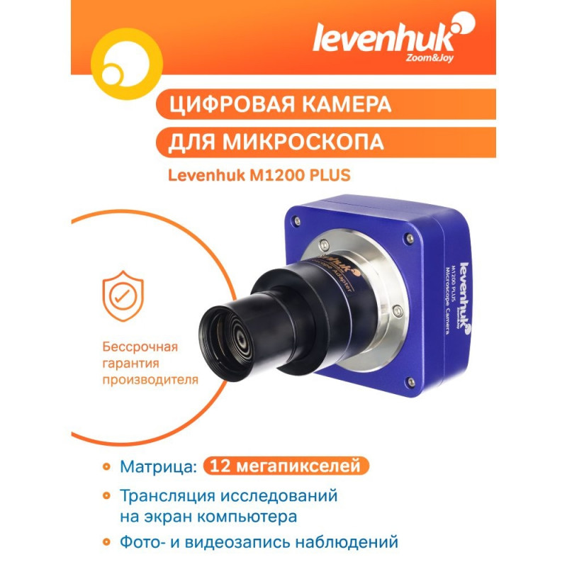 The 12MP Levenhuk M1200 PLUS Digital Camera produces high-resolution well-detailed photos and videos of samples while observing with microscopes of any manufacturer. The camera is mounted in a 23.2mm eyepiece tube (with an adapter that can be mounted in 30mm and 30.5mm eyepiece tubes). It is a universal tool suitable for both professional research and hobbies. The camera can also be used as a digital eyepiece to live stream the process of the study on a computer screen.