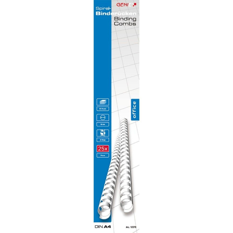 GENIE Spiraalköite selgrood 10mm valged, 25 tk (EAN: 4015468123792) on ideaalne valik kõigile, kes soovivad oma dokumente, aruandeid, esitlusmaterjale või õppematerjale professionaalselt ja korrektselt köita. Need valged plastikust spiraalköite selgrood sobivad suurepäraselt nii kontorisse, kooli kui ka kodukasutajale, pakkudes lihtsat ja kiiret viisi dokumentide organiseerimiseks ning esitlemiseks.