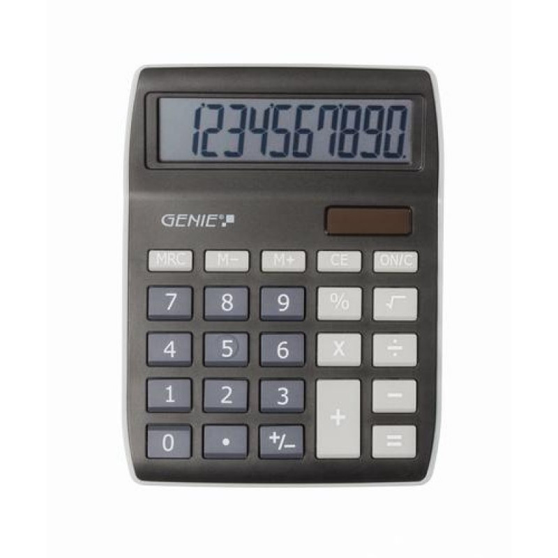 <b>10-digit desktop calculator with dual power (solar and battery), black</b><br><br>Compact desktop calculator with large, angled, 10-digit display<br>Fresh, colourful design, high quality finish<br>Keyboard: easy-to-use and to-clean plastic keys<br>Power supply: Dual-Power (solar power with sufficient light and immediate switch-over to battery operation with too little light) / Battery included<br>Functions: Basic Calculations [+] [-] [x] [/], Root Calculation [?], Percentage [%], 4 Button Memory [M +] [M-] [MR] [MC]Genie 840 BK. Form factor: Desktop, Type: Display. Digits: 10 digits, Display number of lines: 1 lines, Display tilting. Power source: Battery/Solar. Product colour: Black, Grey
