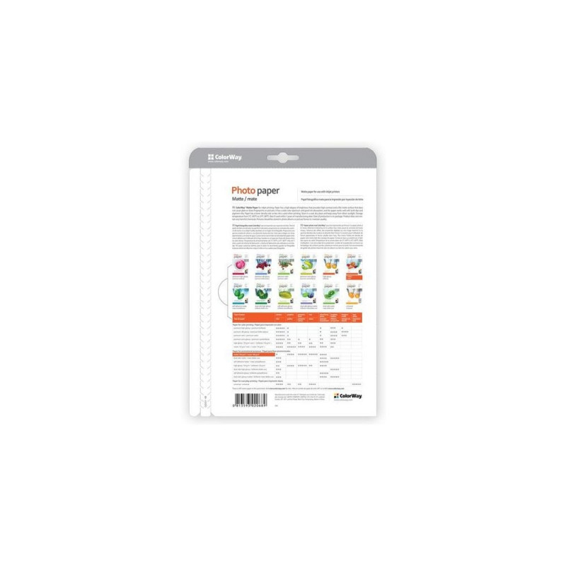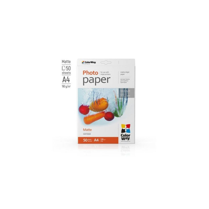 Matte paper ColorWay® for inkjet printing. Paper has a high brightness and a flat matte surface. Paper provides a stark contrast without glare and won't show fingerprints. It has a wide color spectrum and good ink absorption. Store in a cool, dry place and keep away from direct sunlight. Storage temperature from 5°C (41°F) to 25°C (77°F). Best if used within 5 years from manufacturing date. Date of production is on package. Paper does not contain any harmful chemicals. Pictures should be stored in photo albums or picture frames to maintain quality. This paper model is intended only for inkjet printing and personal use.Colorway PM190050A4. Finish type: Matt, Media weight: 190 g/m², Paper size: A4. Package type: Box