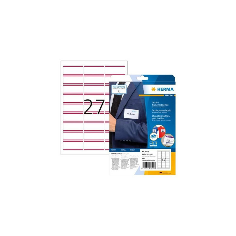 Labels made of acetate silk, on A4 sheets, self-adhesive. Ideal for use at seminars, conferences, trade fairs, or for the labelling of fabrics, carpets and mattresses. A handy alternative to plastic badges: quick printing, firm adhesion without a pin or clip. Flexible textile material, reliable adhesion, easy to remove. Caution: these labels should not be applied to fine leather or textiles such as silk or velvet. For laser printers, copiers, colour laser printers and colour copiers. Not suitable for inkjet printers.HERMA 4512. Product colour: Red, White, Shape: Rounded rectangle, Print technology: Laser. Width: 63.5 mm, Height: 29.6 mm. Labels per pack: 540 pc(s)