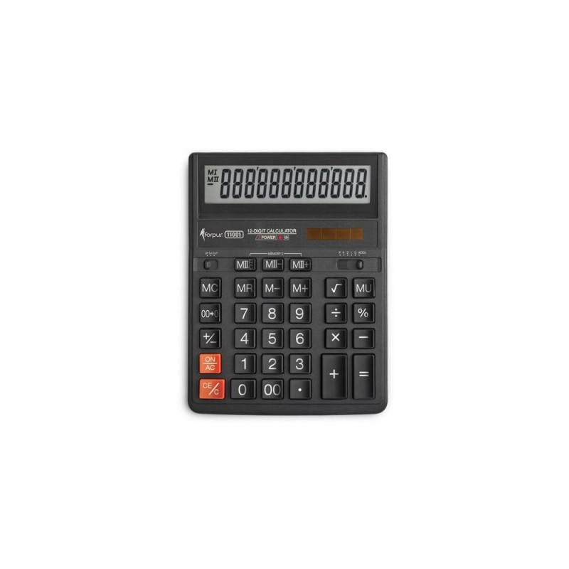 Calculator with an LCD 12-digits display. Double power supply: Battery + solar elements. 2 memory registers. Black color.Forpus FO11001. Form factor: Desktop, Type: Basic. Digits: 12 digits. Memory registers: 2. Power source: Battery/Solar. Product colour: Black