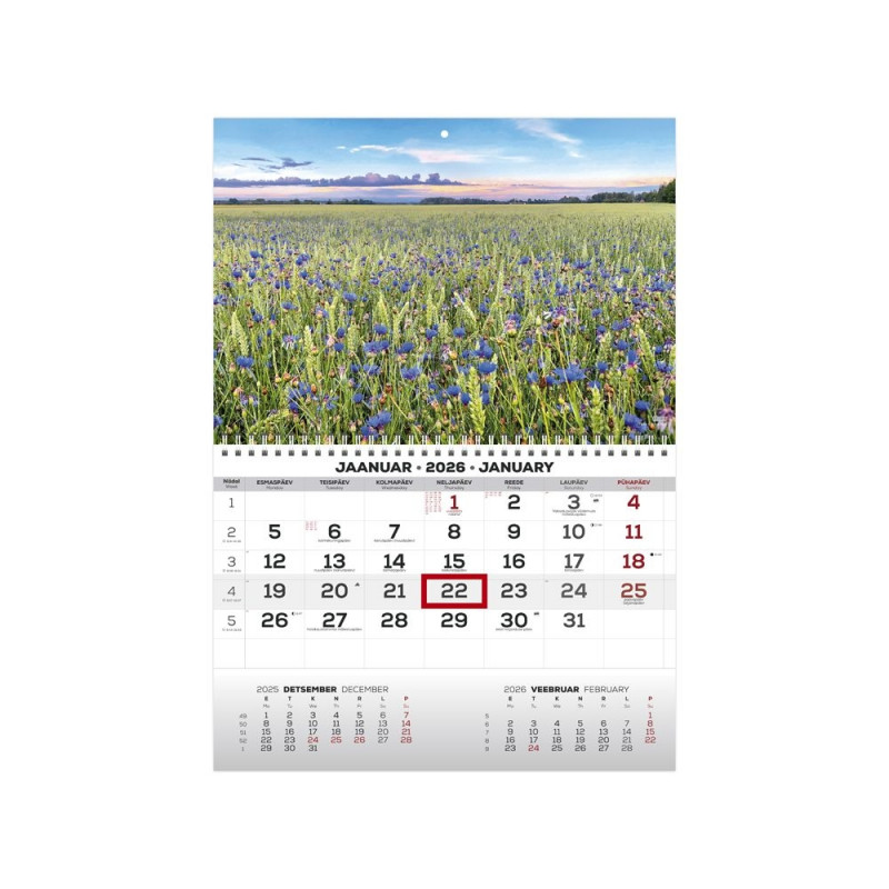 riigipühad, riiklikud ja rahvakalendri tähtpäevad, lipuja nimepäevad, 38 riigi riigipühad lühenditega, suveja talveajale üleminek, päikese tõusu ja loojangu kellaajad (Tallinn), kuu faasid, sodiaagimärgid, aastaaegade algused kellaaegadega, eelnev ja järgnev kuu, nädala number.