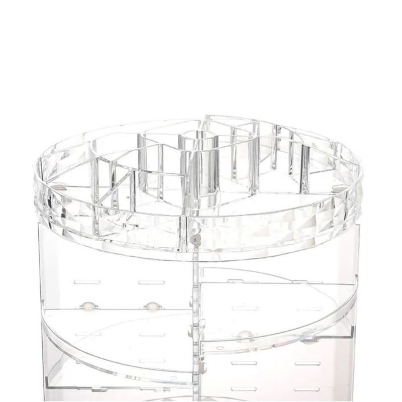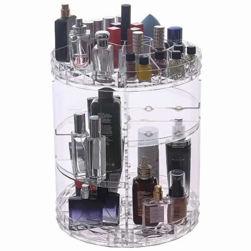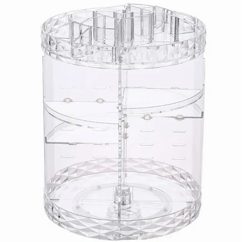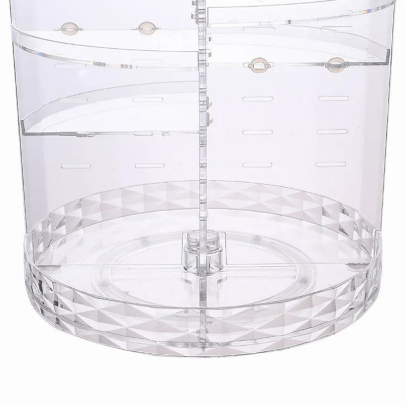 Äärmiselt praktiline, pöörlev pintslite ja kosmeetika korraldaja nelja kinnitatava riiuliga. Läbipaistev konstruktsioon võimaldab pidevalt jälgida korraldaja sisu. Mahuti sobib suurepäraselt kosmeetikatoodete hoidmiseks, mis seni vedelesid sinu käekotis või laual. Tänu universaalsele disainile sobitub see iga ruumi sisekujundusega.