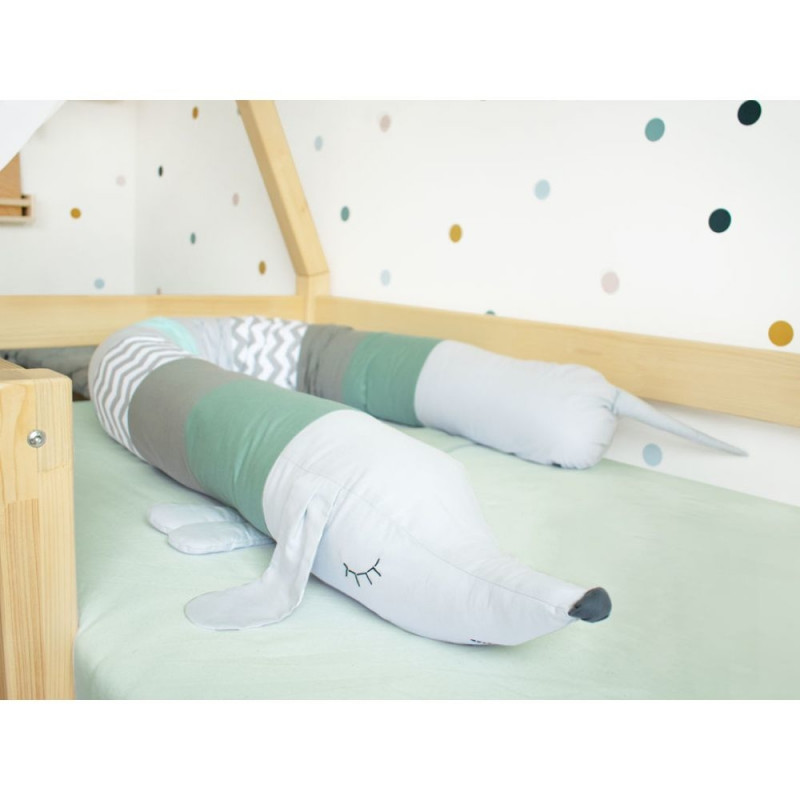 Värviline puuvillane voodipehmendus lastevoodi jaoks DACHSHUND kujundusega. Käsitsi õmmeldud pehmendus on täidetud allergiavastase silikoonkiuga. Mõõdud: pikkus 250 cm, kõrgus/laius 14-15 cm. Pehmendus sobib ideaalselt lapsevooди kaunistuseks, pika padjana või originaalse magamismänguasjana. Kätesoojendus on hõlpsalt hooldatav tänu eemaldatava täidisega tõmblukuga.