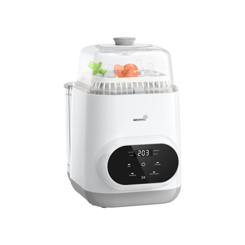 Grownsy multifunktsionaalne lutipudelite puhastaja on terviklik lahendus lapsevanematele, kes soovivad tagada oma beebitarvikutele täiusliku hügieeni – ilma igapäevase küürimise ja ajakuluta. Seade ühendab endas pesemise, auruga steriliseerimise ja kuuma õhuga kuivatamise, võimaldades samal ajal ka ohutut hoiustamist. Tänu intelligentsele tsüklite juhtimisele saad paindlikult otsustada steriliseerimis- või kuivatusprotsessi üle – ilma et peaksid kogu programmi uuesti alustama.