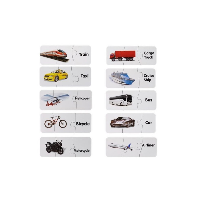Harivad mõistatused on hea harjutus kujutlusvõimele, laiendavad teadmisi ning arendavad kannatlikkust. Kõik see tuleb lapsele tulevikus kasuks. Pusletükkide sobitamise kaudu saab laps teada, kuidas näevad välja maismaal, vees ja õhus liikuvad sõidukid. Igal sõidukil on juures ingliskeelne nimetus, tänu millele õpib laps põhisõnavara. Kõigist pusledest saab moodustada kuni 10 ühendust. Puslel on näha näiteks helikopterit ja laeva.