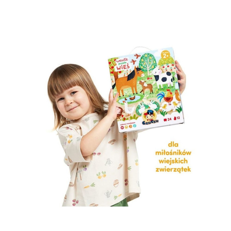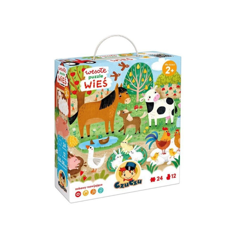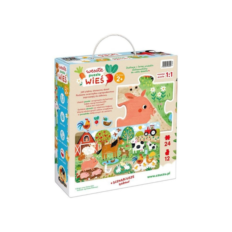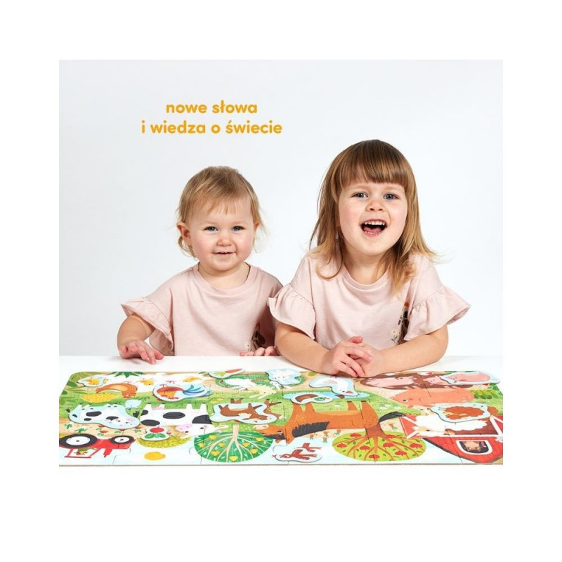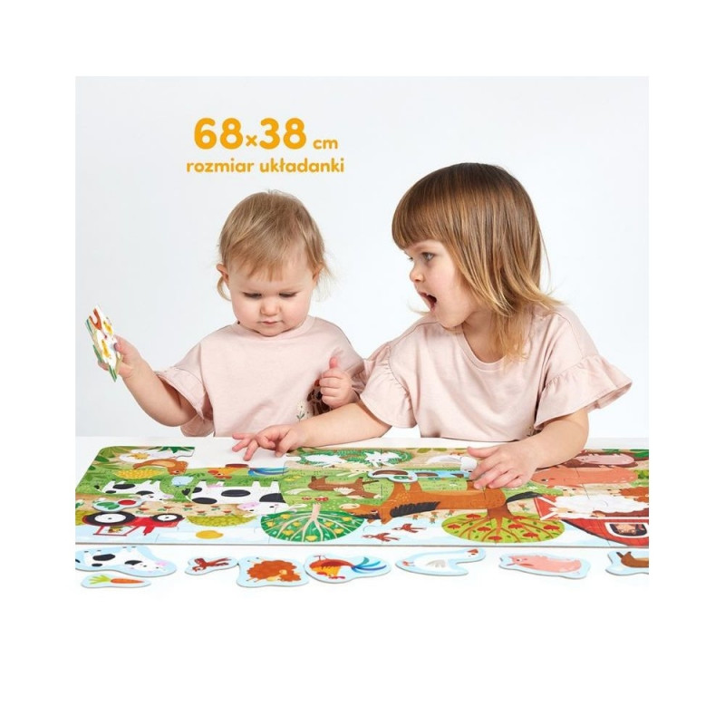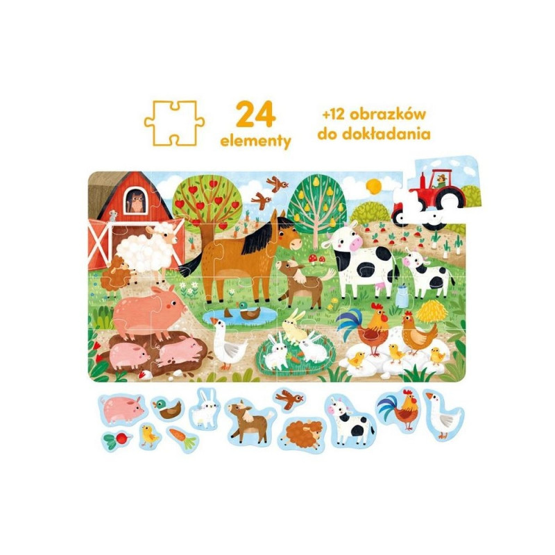 Suur, kaunis illustratsioon kujutab päikeselise talumajapidamise sõbralikke elanikke. Keda kutsute üheskoos puslet kokku panema? Selles komplektis leiate lisaks 24 suurele tükile ka 12 väikest pilti, mida saab juurde lisada.