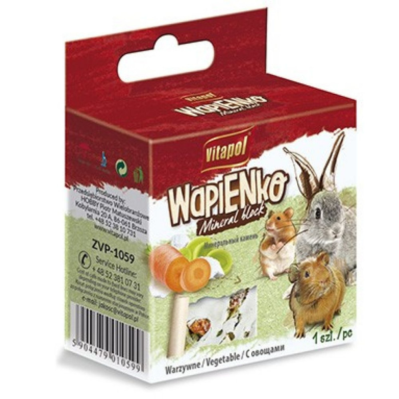 Vitapol, mineraalkivi närilistele, aedviljadega, 40g. Täiendsööt närilistele. Mineraalkivi on rikkalik kaltsiumiga. Kasutamisjuhis: kinnitada puuri sees hästi kättesaadavas kohas. Koostis: kips, aedvaljad. Sisaldab: valk 2,4%, rasv 0,4%, kiudained 0,6%, tuhka 44,5%. Hoida kuivas jahedas kohas.
