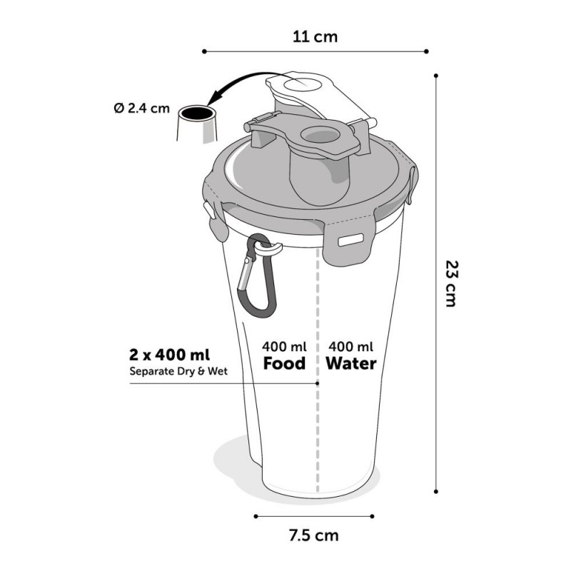 Komplekti kuulub tugev pudel kahe eraldi 400ml sahtliga ja kaks kokkuvolditavat nõud, mõlemad 375ml. Kokkuvolditavad toidu- ja veekauss on karabiiniga pudeli külge kinnitatavad. Pudelil on eraldi sahtlid vee ja toidu jaoks.