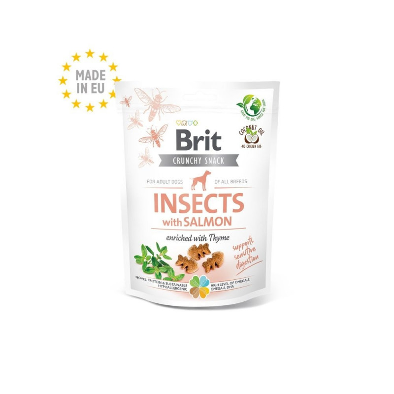 Brit Care putukate, lõhe ja tüümianiga maius. Funktsionaalne täiendsööt täiskasvanud koertele. Tundliku seedimise parandamiseks. Tervislik ja maitsev preemia. Putukavalk – väga hästi seeditav ja väikese allergiaohuga. Suur rasvhapete sisaldus terve naha ja läikiva karvkatte jaoks. Väike süsiniku jalajälg - taaskasutatav pakend ja putukavalk on väga loodussõbralikud. Toodetud EL-is.