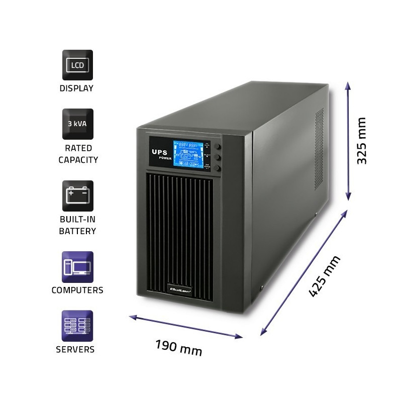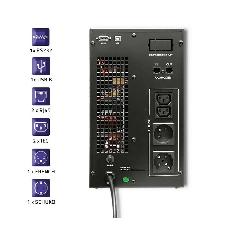 | Special functions | Double conversion SNMP card (Optional): Integrates multi-network communication protocols to allow comprehensive, easy to understand and secure remote monitoring, Manages UPS via the Internet, LCD display Pure sine Automatic charging in the OFF Mode Sound |