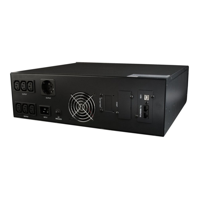 | Funktsioonid | Automatic output voltage regulation (AVR). Rack 3.4U metal case. USB control interface LCD display. Short circuit protection. Compatible with power generators of any brand Surge, spike and lightning protection. Audible and visual alarms. Overcharge and ov |