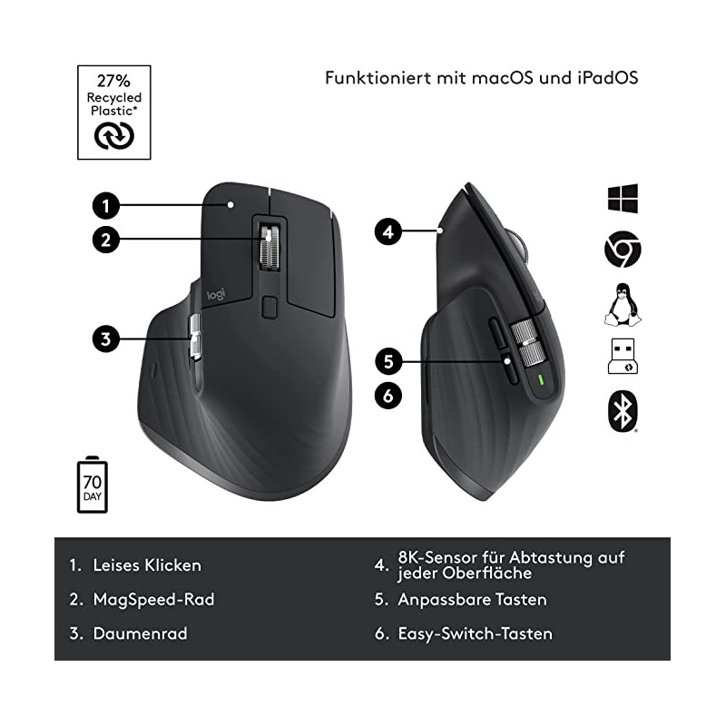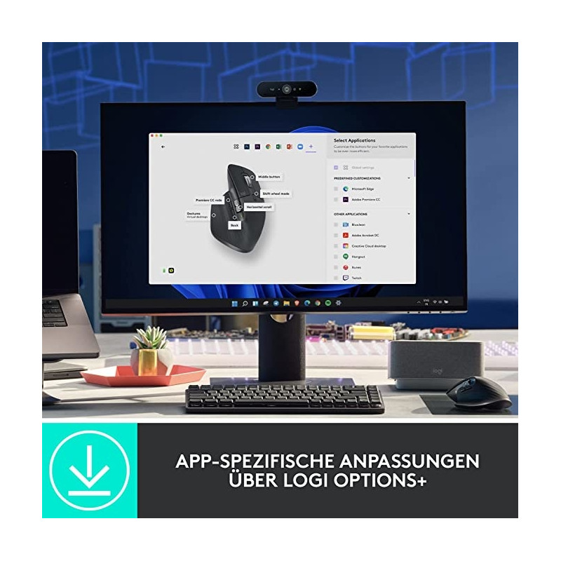 Sujuv ühenduvus ja mitme seadme haldusMX Master 3S toetab Flow-tehnoloogiat, mis võimaldab sul juhtida mitut arvutit korraga ja liigutada kursorit ühe ekraani servast teise. Sa saad kopeerida teksti, pilte ja faile ühest seadmest teise, isegi kui need kasutavad erinevaid operatsioonisüsteeme. Hiir ühildub kuni kolme seadmega Bluetooth Low Energy kaudu või kaasasoleva Logi Bolt vastuvõtjaga.