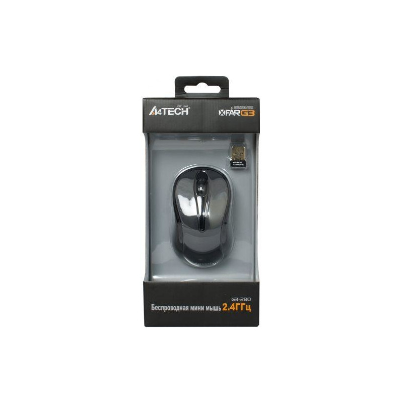 - Wireless mouse.- Nano receiver.- 2 AAA alkaline batteries.A4Tech G3-280A. Movement detection technology: Optical, Device interface: RF Wireless, Movement resolution: 1000 DPI, Buttons quantity: 2, Scroll type: Wheel. Power source: Batteries. Product colour: Black, Grey