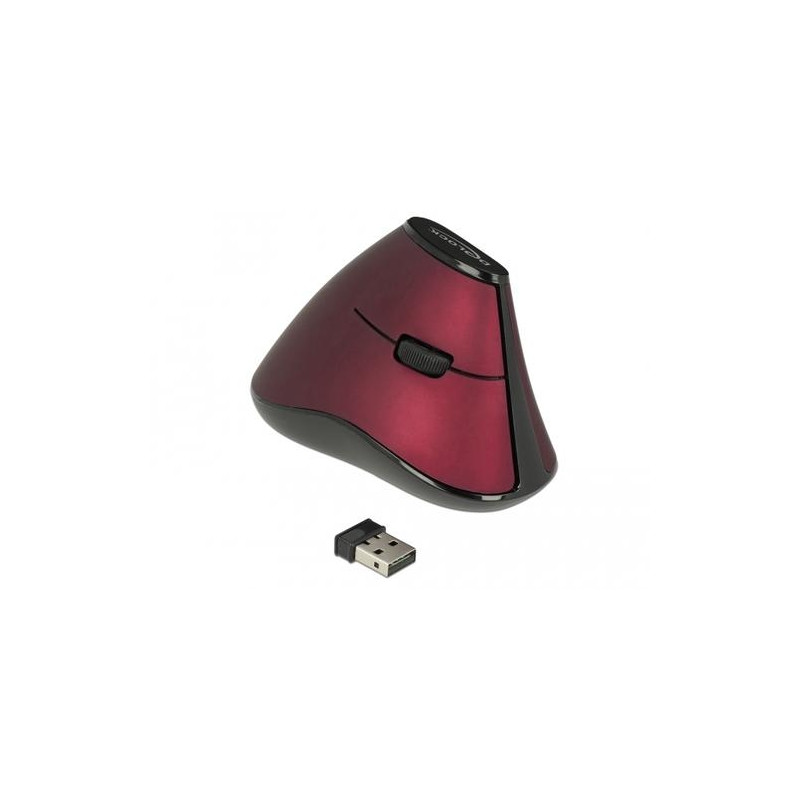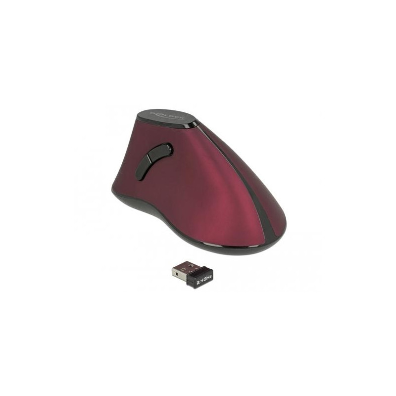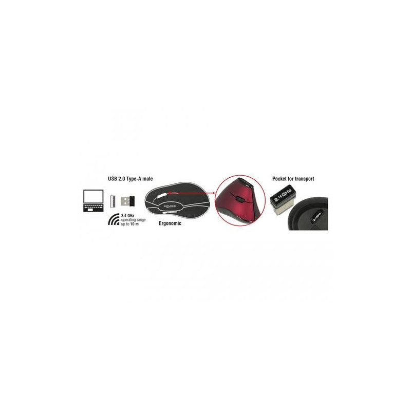 This wireless vertical mouse by Delock is suitable for right handers and will be connected to the computer via the compact USB receiver. During transport it can be placed inside a compartment at the bottom of the mouse. The 2.4 GHz wireless technology provides a maximum operating range of up to 10 meters. Due to its ergonomic design, the hand remains in upright position and does not have to be turned. Thus the mouse can be used preventive or with starting pain e.g. RSI (Repetitive-Strain-Injury).DeLOCK 12528. Form factor: Right-hand. Movement detection technology: Optical, Device interface: RF Wireless, Movement resolution: 1000 DPI, Buttons type: Pressed buttons, Buttons quantity: 4, Scroll type: Wheel. Power source: Batteries. Product colour: Black, Red