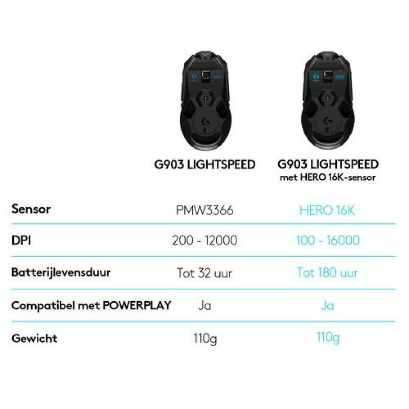 <br />Logitech G G903 LIGHTSPEED Gaming Mouse with HERO 25K sensor. Form factor: Ambidextrous. Movement detection technology: Optical, Device interface: RF Wireless, Movement resolution: 25600 DPI, Response time: 1 ms, Buttons type: Pressed buttons, Buttons quantity: 11, Scroll type: Wheel, Acceleration (max): 40 G. Illumination colour: Multi. Power source: Batteries. Product colour: Black