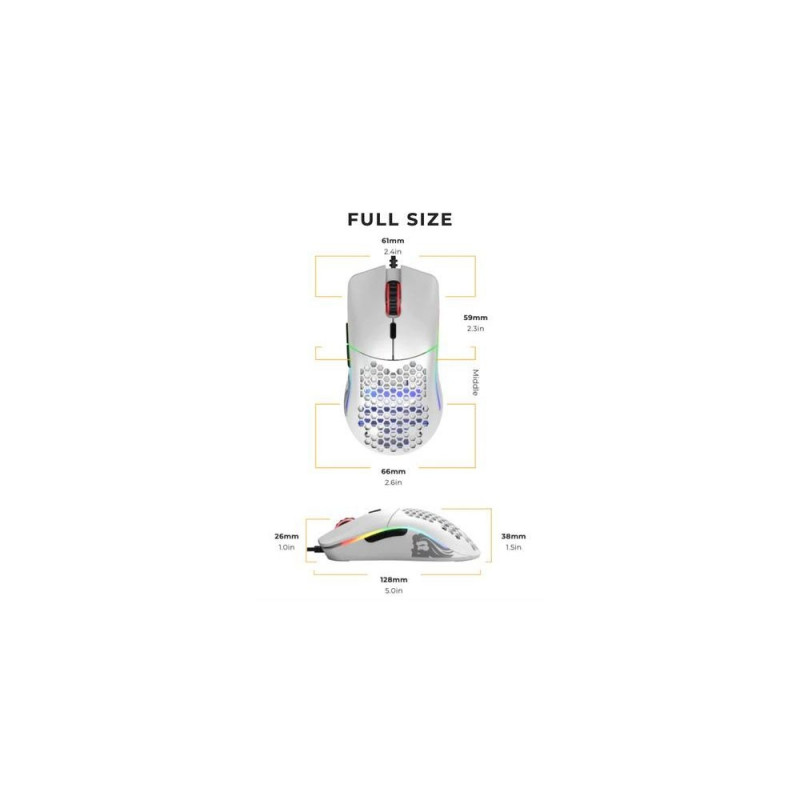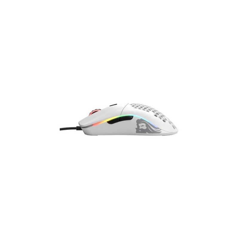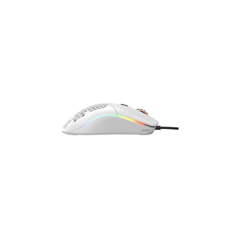 This is Model O the world’s lightest RGB gaming mouse<br>Envisioned by a community of passionate gamers, and developed by a team who accepts nothing less than perfection - Model O will elevate your play to unimaginable heights. Built for speed, control, and comfort - we packed a full suite of ultra-premium features into an impossibly lightweight, ambidextrous frame. Welcome to the next level of Competitive E-Sports gaming. Prepare for Ascension.<br><br>HoneyComb Shell<br>Strength and Comfort<br>Model O’s Honeycomb Shell is the key to achieving a feather-light weight while maintaining its ultra-durable strength. You’ll barely feel the holes during gameplay, but they provide ventilation to keep your palms cool & fresh. Cleaning the Model O is easy, just use any air canister to keep your mouse good as new.<br><br>Ascended Cord<br>Light and Flexible<br>Like it's not even there<br>Stock cables suck. Say goodbye to 3rd party mods, and say hello to the Ascended Cord. Our proprietary braided cable is ultra-flexible and super lightweight, giving your mouse an almost wireless feel.<br><br>Glide smoothly with <br>G-Skates Feet<br>No more shoddy stock mouse feet or buying 3rd party add-ons. Model O comes included with our premium G-Skates - 100% pure Virgin PTFE, rounded edges that don’t snag on your pad so your mouse will glide like blades on ice. Comes in 0.81mm thickness for maximum lifespan.<br><br>DPI Indicator<br>The dedicated DPI indicator can be set to any value and colors you choose (requires software), so you always know your value when adjusting on the fly.<br><br>Pixart® 3360 Sensor<br>The competitive E-Sports industry standard. Pixel perfect tracking, zero mouse acceleration, no more spinouts, 1000 Hz polling rate, less than 0.7mm lift-off distance.<br><br>This is Model O<br>Shape and size are important when selecting your mouse. Below are the measurements of the Model O.<br><br>20 Million Clicks<br>Don’t let competitors fool you with inflated stats on low-quality switches. Model O comes with state-of-the-art Omron switches, with the highest durability rating and quality control standards. The Model O will outlive other inferior gaming mice.Glorious PC Gaming Race Model O. Form factor: Right-hand. Movement detection technology: Optical, Device interface: USB Type-A, Movement resolution: 12000 DPI, Buttons type: Pressed buttons, Buttons quantity: 6, Scroll type: Wheel, Acceleration (max): 50 G. Illumination colour: Blue, Green, Red. Power source: Cable. Product colour: White
