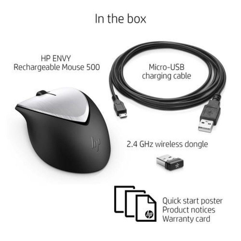 A wireless, rechargeable mouse with impressive styling<br>Being at the pinnacle of productivity requires a device that understands the balance between performance and precision. With meticulous design and undeniable power, this mouse is as versatile as it is comfortable, seamlessly fitting into your lifestyle—from your office to your life at home.HP ENVY Rechargeable Mouse 500. Form factor: Ambidextrous. Movement detection technology: Laser, Device interface: RF Wireless, Movement resolution: 1600 DPI, Buttons type: Pressed buttons, Buttons quantity: 2, Scroll type: Wheel. Power source: Batteries. Product colour: Black, Grey