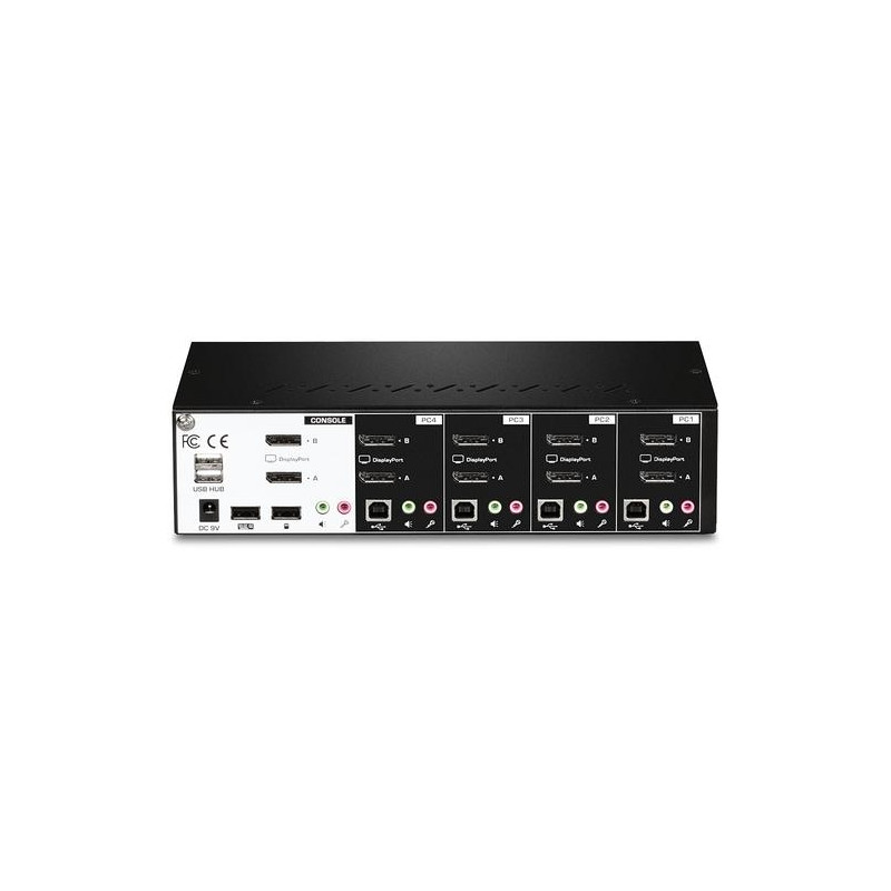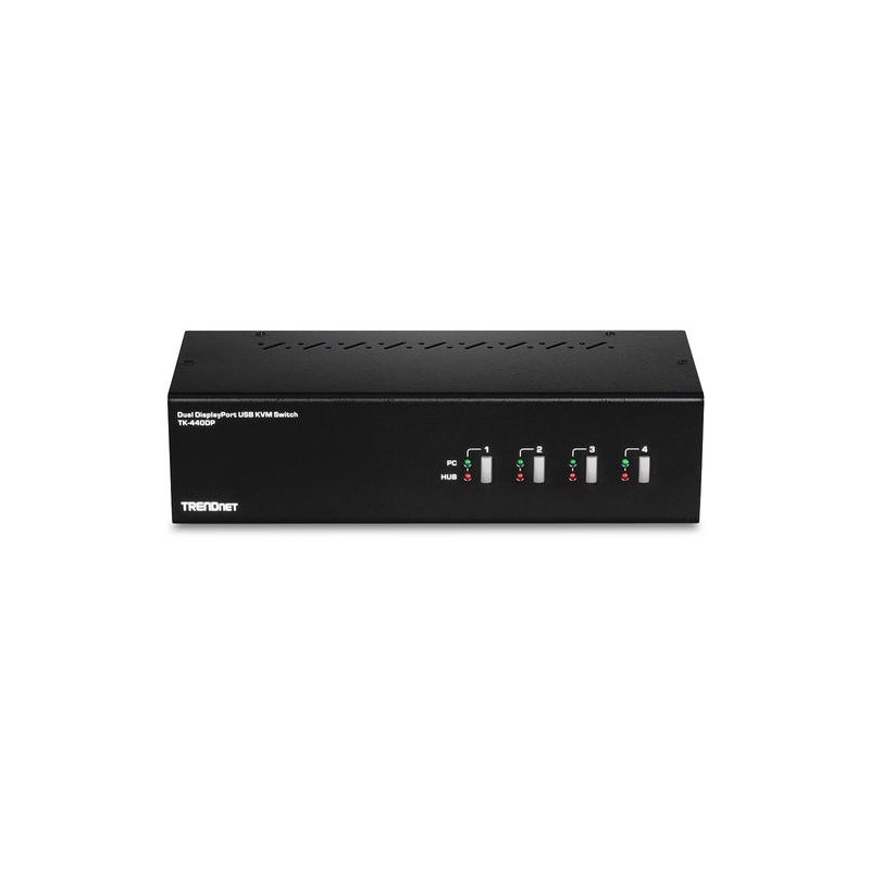 TRENDnet’s 4-Port Dual Monitor DisplayPort KVM Switch, model TK-440DP, allows you to control four computers with one set of console controls. Experience up to 4K UHD resolutions, no driver installation required. The TK-440DP is designed for dual monitor systems with USB mouse and keyboard connections, and features a two-port USB hub to share storage devices or printers between computers.<br><br><b>Dual Monitor</b><br>Designed to connect to two DisplayPort monitors.<br><br><b>4K UHD Resolution</b><br>Supports resolutions up to 4K UHD (3840 x 2160 @ 60Hz).<br><br><b>USB 2.0 Hub</b><br>Two additional USB ports to connect storage drives and printers.<br><br><b>4-Port Dual Monitor KVM</b><br>Control up to four computers with dual monitor support<br><br><b>DisplayPort Monitor</b><br>Designed to connect to two DisplayPort monitors<br><br><b>4K UHD</b><br>Supports resolutions up to 4K UHD (3840 x 2160 @ 60Hz)<br><br><b>Audio Support</b><br>Full audio support maximizes work station productivity<br><br><b>USB Mouse & Keyboard</b><br>True Transparent USB (TTU) emulation technology supports most keyboard and mouse designs<br><br><b>Housing</b><br>Rugged metal enclosure<br><br><b>USB 2.0 Hub</b><br>Two additional USB ports to connect storage drives and printers<br><br><b>Hot Keys</b><br>Hot Key command shortcuts<br><br><b>Easy Installation</b><br>Simple setup with driverless installationTrendnet TK-440DP. Keyboard port type: USB, Mouse port type: USB, Video port type: DisplayPort. HD type: 4K Ultra HD, Maximum resolution: 3840 x 2160 pixels, Video bandwidth: 144 Hz. Product colour: Black, Silver, Certification: CE, FCC. Power source: AC, Input voltage: 100 - 240 V, AC input frequency: 50 - 60 Hz. Width: 254 mm, Depth: 100 mm, Height: 66 mm