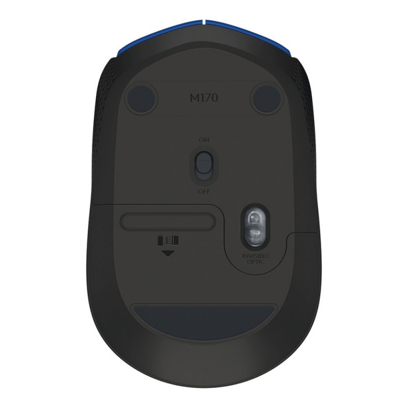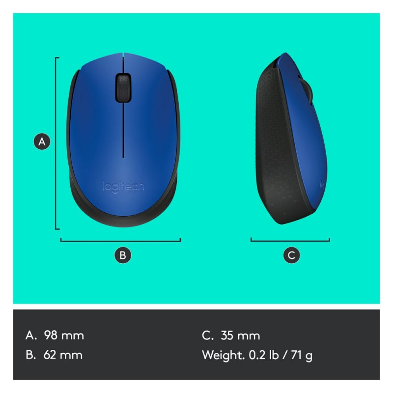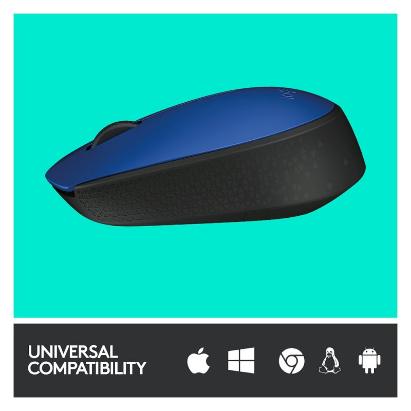 Logitech M171. Vormifaktor: Mõlema käega kasutatav. Liikumise tuvastamise tehnoloogia: Optiline, seadme liides: RF juhtmevaba, liikumise eraldusvõime: 1000 DPI, klahvitüüp: vajutatavad nupud, nuppude arv: 2, kerimise tüüp: rullik. Toiteallikas: Patareid. Toote värv: must, sinine.