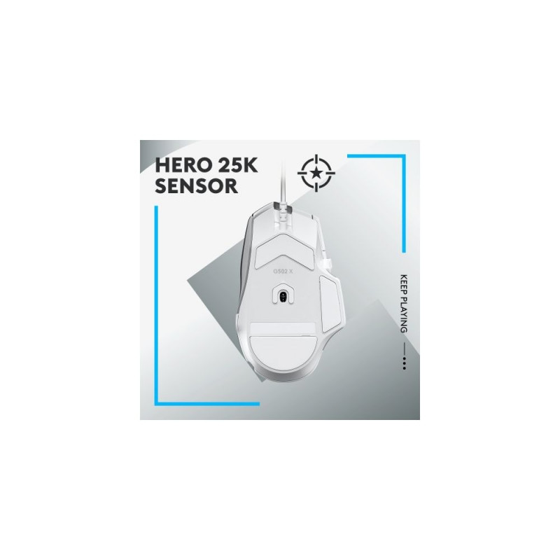 Logitech G G502 X Gaming Mouse. Form factor: Right-hand. Movement detection technology: Optical, Device interface: USB Type-A, Movement resolution: 25600 DPI, Buttons type: Pressed buttons, Buttons quantity: 13, Scroll type: Wheel, Acceleration (max): 40 G. Power source: Cable. Product colour: White