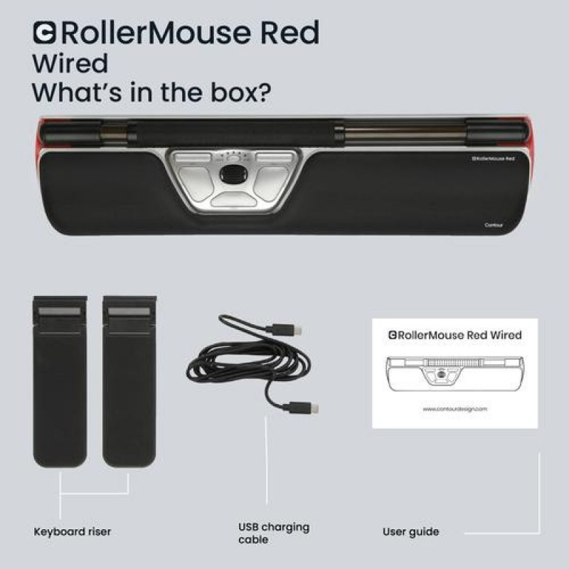 If you work constantly on a computer, chances are high you’ve had pain or have it still. RollerMouse Red is the ultimate in pain-relieving ergonomic mice. Specifically designed to reduce pain in the neck, shoulders, forearm or wrist, this mouse offers you the physical support and precise navigation you need to get the job done. Like all centred mice, the central controls mean there’s no strain on your shoulders from having to reach, and your arms and wrists are kept in a comfortably natural position. <br>Operated by either hand or both hands, the patented and textured rollerbar evenly distributes movement to minimise strain. The textured rubber rollerbar makes it easy to precisely move and click the cursor, important during intense computer work. With recycled aluminium construction and memory foam wrist rests, RollerMouse Red is a highly comfortable ergonomic mouse. Adjustable controls, different sized wrist pads and software customisation mean that RollerMouse Red always fits your requirements. And you can rest easy knowing that we’ve used recycled materials to minimise the carbon footprint too.Contour Design RollerMouse Red, wired. Device interface: USB Type-C, Movement resolution: 2800 DPI, Buttons type: Pressed buttons, Buttons quantity: 6, Scroll type: Wheel/Rollerbar. Power source: Cable. Product colour: Black, Silver