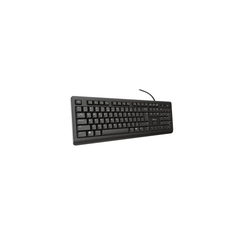 <b>TK-150 Keyboard</b><br>Full-size keyboard with a soft keystroke and spill-resistant design<br><br><b>Cover the Basics</b><br>Keyboards come in all shapes and sizes, but what if you only need to cover the basics? The Trust TK-150 does exactly that. It has a full-size layout, spill resistant keys and it’s height adjustable. It even comes in easy-to-open and sustainable packaging, helping both the environment and saving valuable time. The TK-150 does exactly what you want it to do.<br><br><b>Comfort</b><br>A good keyboard needs to be comfortable to use. The low profile keys in this full-size keyboard and the fold-out feet provide exactly the comfort you need to focus on your work. You don’t even have to worry about spilling something on the TK-150, as the spill resistant design will let you continue your work without hassle. Just poor yourself a new cup of coffee and let’s go.<br><br><b>Easy</b><br>Plug in the 180cm long USB cable and you’re good. When you’ve got work to do, you don’t want to worry about installing software or setting macros. The TK-150 is a workhorse so you can focus on the job at hand.Trust TK-150. Keyboard form factor: Full-size (100%). Keyboard style: Straight. Connectivity technology: Wired, Device interface: USB, Keyboard key switch: Membrane, Keyboard layout: QWERTZ, Keyboard number of keys: 104. Cable length: 1.8 m. Recommended usage: Office. Product colour: Black