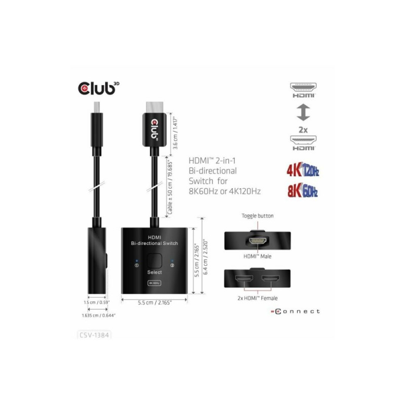 CLUB 3D HDMI 2-in-1 Bi-directional Switch for 8K60Hz or 4K120Hz