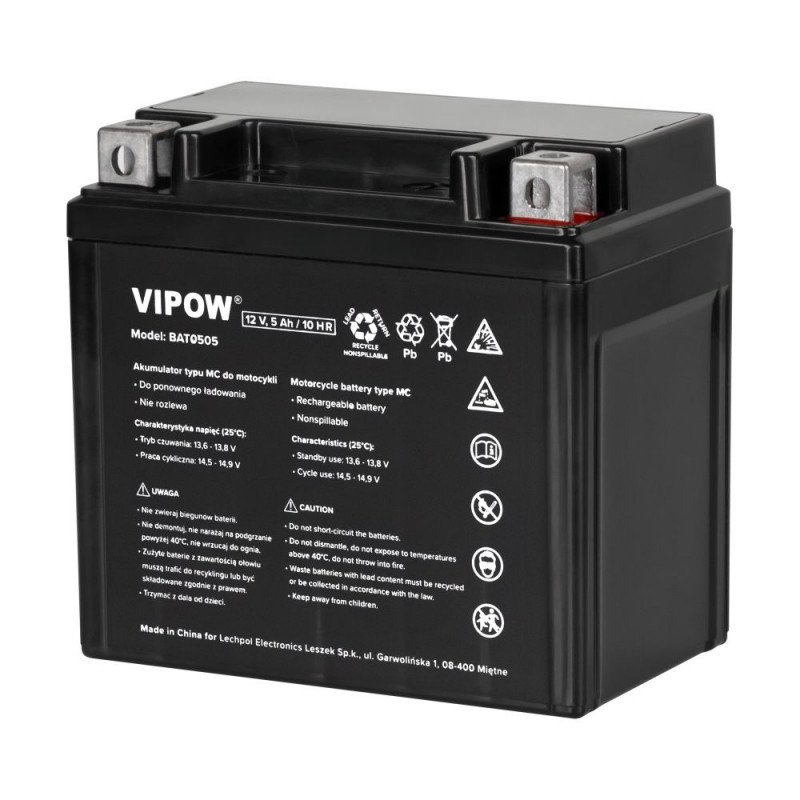 Akumulaator VIPOW tüüp MC 12V 5Ah on lahendus, mis on mõeldud mootorratastele ja teistele ühejalgsetele sõidukitele. See tagab piisava võimsuse mootori käivitamiseks ning põhiliste elektriseadmete toiteks.