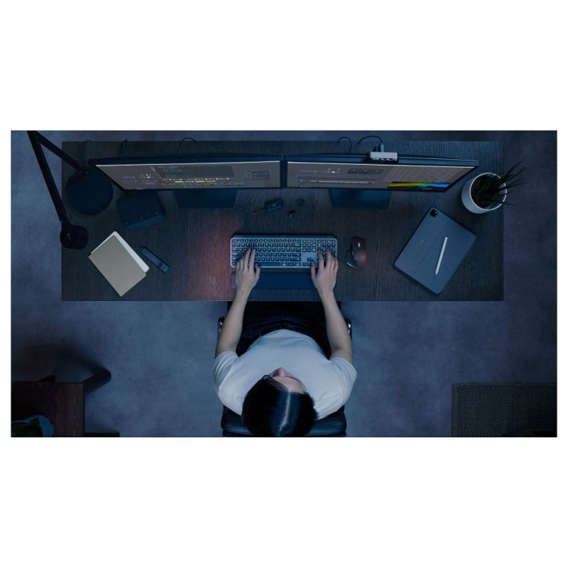 Logitech Master MX Keys S. Klaviatuuri vorming: Täissuuruses (100%). Klaviatuuri stiil: Sirge. Ülekandetehnoloogia: Juhtmevaba, seadme liides: Bluetooth, klaviatuuri lüliti: käärmehhanism, klaviatuuri paigutus: QWERTY. Taustvalgustuse tüüp: LED. Soovitatav kasutus: Universaalne. Toote värvus: Grafiit.