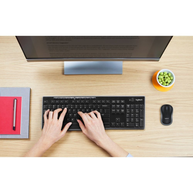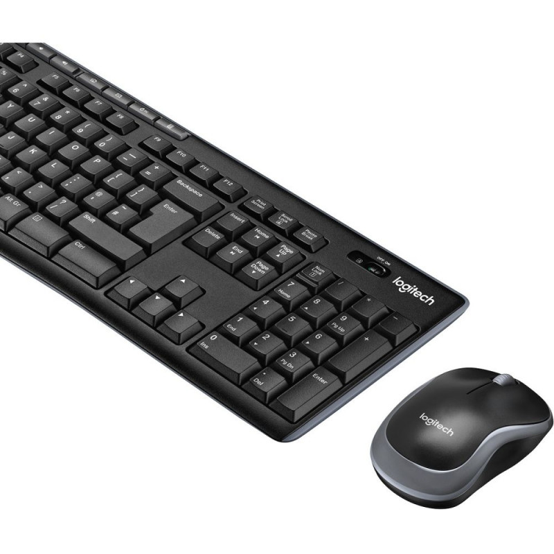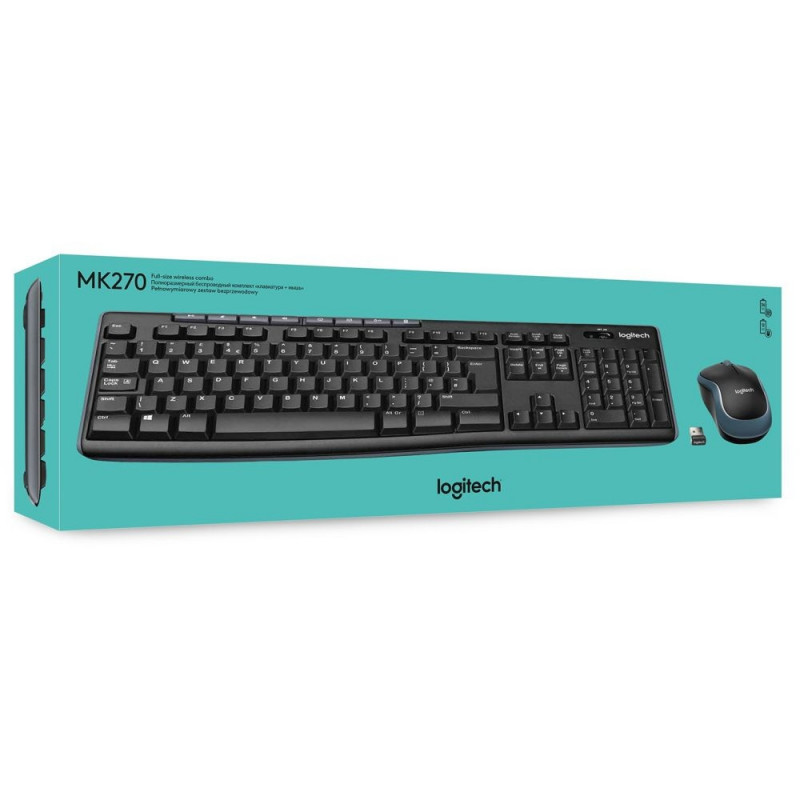 Logitech MK270. Klaviatuuri vorming: Täissuurus (100%). Klaviatuuri stiil: Sirge. Ülekandetehnoloogia: Juhtmega, Seadme liides: RF juhtmevaba, Klaviatuuri paigutus: AZERTY, Klahvide arv: 111, Soovitatav kasutus: Kontor. Toote värvus: Must. Hiir kaasas