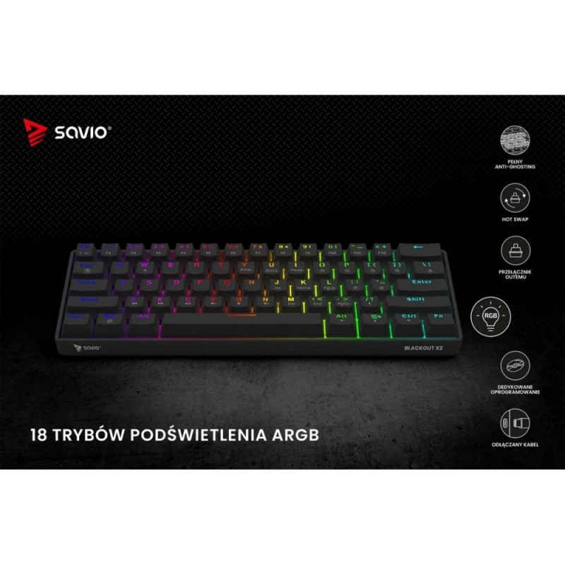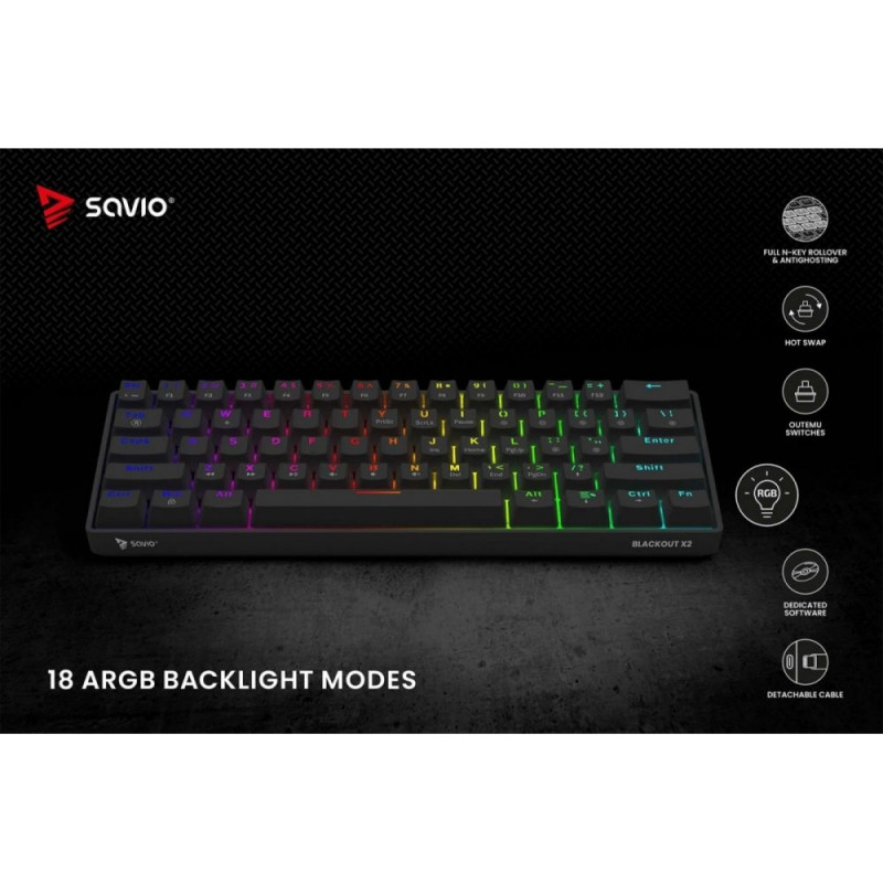 | Other features | Keyboard type: Mechanical Keyboard layout: US (61 keys) Interface: USB Keycaps: ABS Switches: OUTEMU Red / Brown / Blue / Peach Silent (depending on the model) Switch lifespan: 50 000 000 keystrokes Hot Swap: Yes Keyboard dimensions: 292 × 102 × 39 |