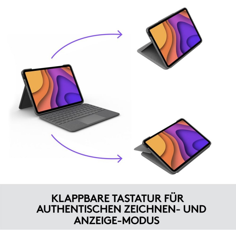 Logitech Folio Touch. Klaviatuuri paigutus: QWERTZ, klaviatuuri keel: Šveits, sisendseade: puuteplaat. Brändi ühilduvus: Apple, ühilduvus: iPad Air (4. põlvkond, 5. põlvkond), toote värvus: hall. Ülekandetehnoloogia: juhtmevaba, seadme liides: Smart Connector. Toiteallikas: dokk. Toetatud mobiilsed operatsioonisüsteemid: iPadOS.