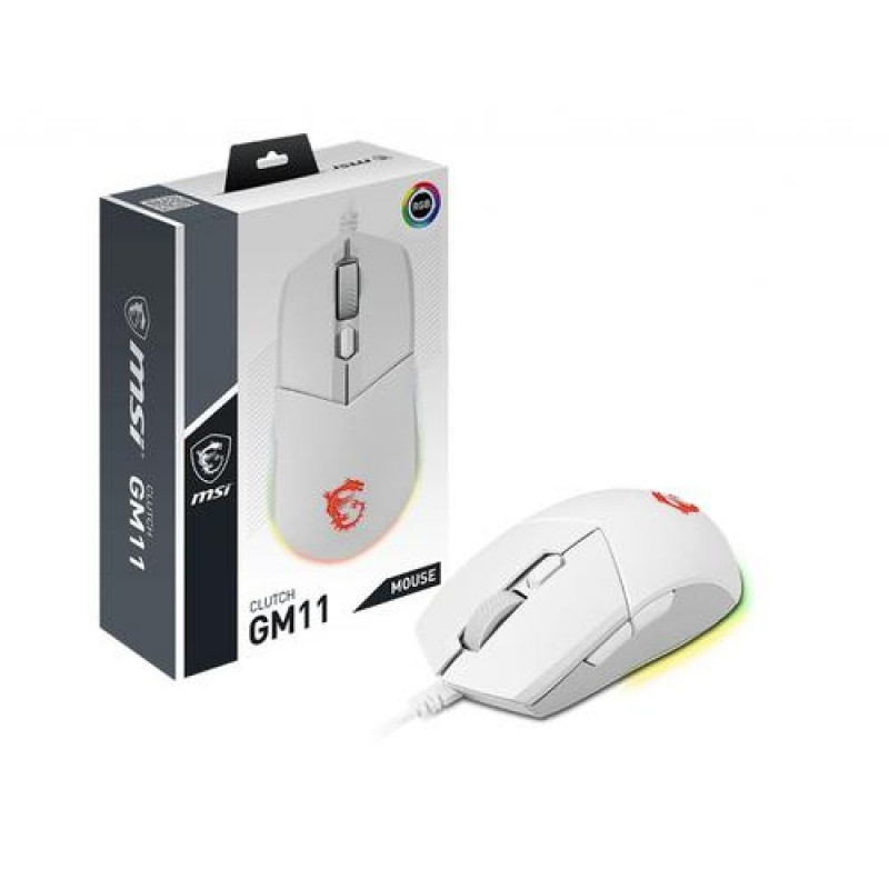 <b>LIGHT UP THE BATTLEFIELD</b><br>Customize your GM11 with millions of colors and over 7 lighting effects.<br><br><b>NO EFFORT IN SETTING UP LIGHTING EFFECTS</b><br>Convenient lighting control allows you to change speed, direction, or mode with ease.<br><br><b>STYLE THAT CANNOT BE DEFINED</b><br>Graphite white brings out the chic, streamlined outlook of GM11 with detail made and highly durable quality.<br><br><b>RAPID CLICKING WITH GREAT PRECISION</b><br>Combining OMRON switches that last over 10 Million clicks and a Pixart Optical sensor that delivers up to 5000 DPI, the GM11 is both accurate and reliable in the heat of battle. A linear engraved scroll wheel and side grips ensure a solid grip on the game.<br><br><b>SYMMETRICAL DESIGN</b><br>The Clutch GM11 has a symmetrical design, making it suitable for both right-hand and left-handed gamers.MSI CLUTCH GM11 WHITE Gaming Mouse '2-Zone RGB, upto 5000 DPI, 6 Programmable button, Symmetrical design, OMRON Switches, Center'. Form factor: Ambidextrous. Movement detection technology: Optical, Device interface: USB Type-A, Movement resolution: 5000 DPI, Buttons type: Pressed buttons, Buttons quantity: 6, Scroll type: Wheel. Illumination colour: Blue, Green, Red. Power source: Cable. Product colour: White